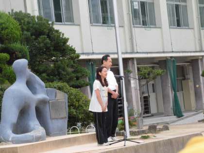 ひまわり学級のサポーターとして、新たに三津山志保さんに来ていただくことになりましたので、児童朝会で紹介しました。
