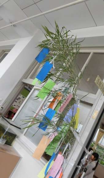 短冊の重みで、ササが完全にしなっている学級もありました。どんな願い事を書いたのでしょう?雨雲のはるか上は、満天の星空です。星に願いが、きっと届くことと思います。