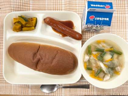 今日の献立は、黒糖パン・ウインナーのケチャップソース・スープ・焼きかぼちゃ・牛乳です。
