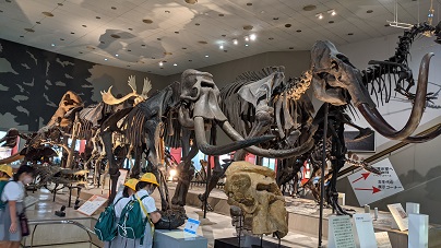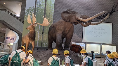 自然史博物館では、テーマ別の展示を見学しました。大きなナウマンゾウのはく製や昆虫の標本、恐竜の化石などを見つけ、「昔ってこんな生き物がいたんや〜!」「蝶だけでも何種類もあるね♪」とニコニコしながら見ていました。