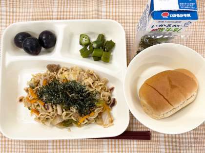 今日の献立は、1/2黒糖パン・焼きそば・オクラの甘酢あえ・ぶどう(巨峰)・牛乳です。