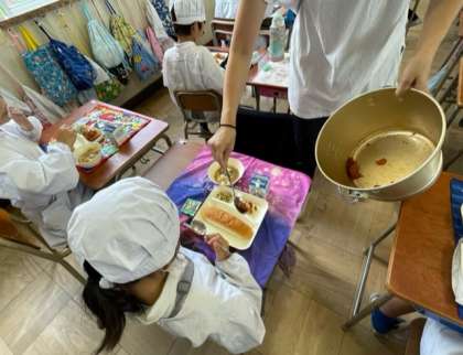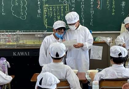 今日の献立は、コッペパン・りんごジャム・ヤンニョムチキン・もやしととうふのスープ・切干しだいこんのナムル・牛乳です。