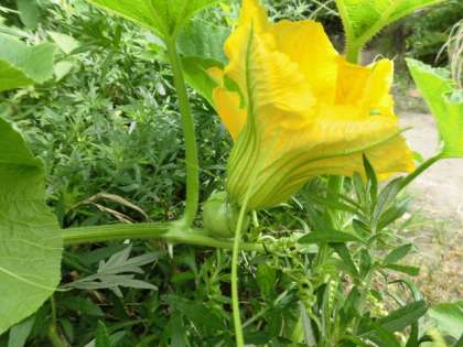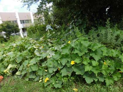 カボチャは、学習園の区画をはるかに超えて広がっています。