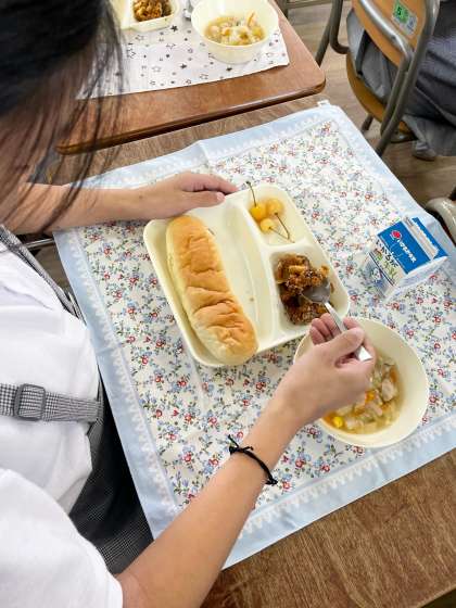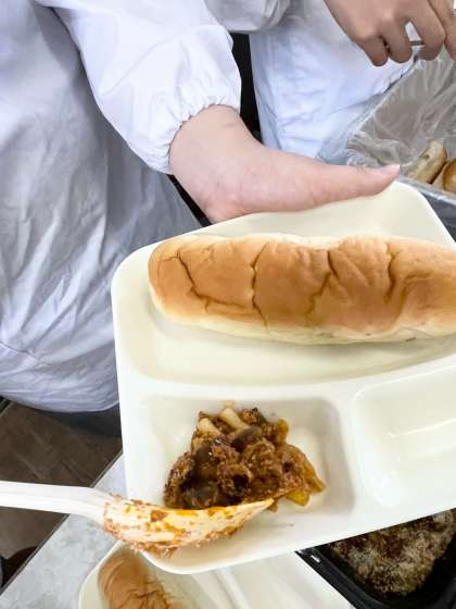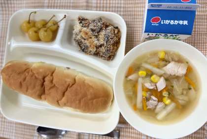 今日の献立は、おさつパン・なすのミートグラタン・鶏肉と野菜のスープ・さくらんぼのかんづめ・牛乳です。