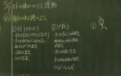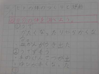しゃがんだり伸びをしたり、いろんなポーズで体のどこがどのようになるか調べて言葉や図で表します。