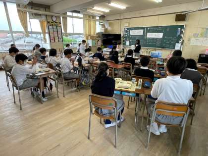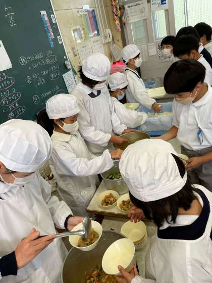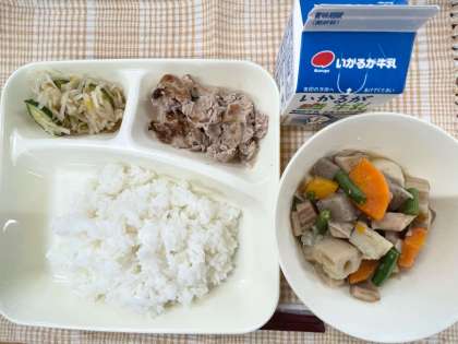 今日の献立は、ごはん・豚肉のねぎじょうゆ焼き・ふきよせ煮・きゅうりともやしの甘酢あえ・牛乳です。