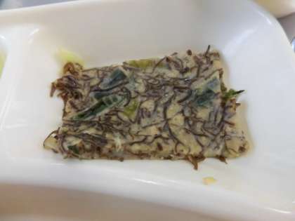 もずく入りヒラヤーチー、豚肉といかの煮もの、あっさりキャベツ