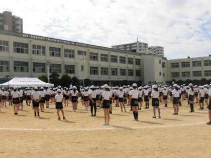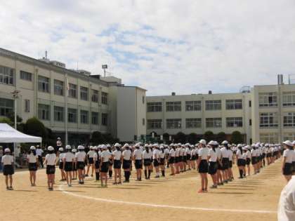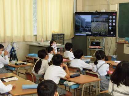 5・6年生は運動場で、1〜4年生は教室でTeamsで参加します。