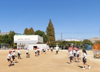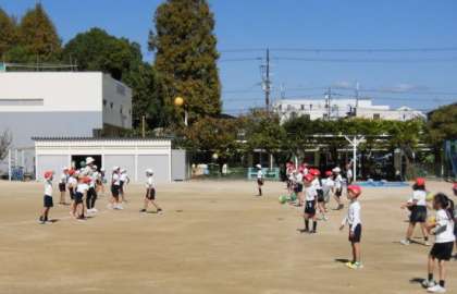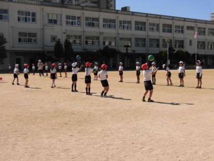 ボールを投げ上げる運動です。まずは、少し高く、続いて中くらいの高さに