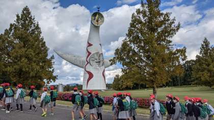 館内の見学が終わり太陽の塔の前で記念撮影をします。