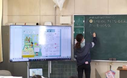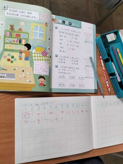 問題づくりの学習です。国語の力も必要です。慣れるまでたいへんですが、教科書の絵をよく見て、先生の話もよく聞いて問題をつくろうとしています。