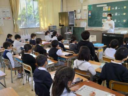 1年生は給食をいつも楽しみにして、しっかり食べています。