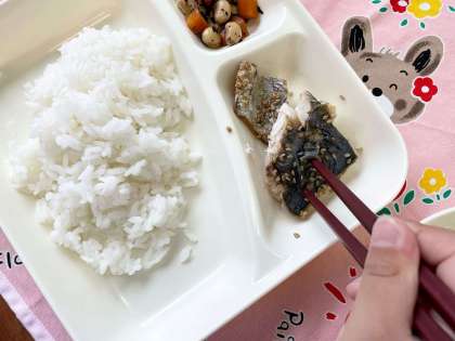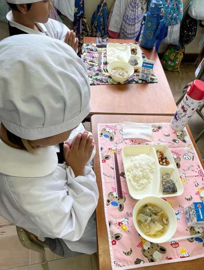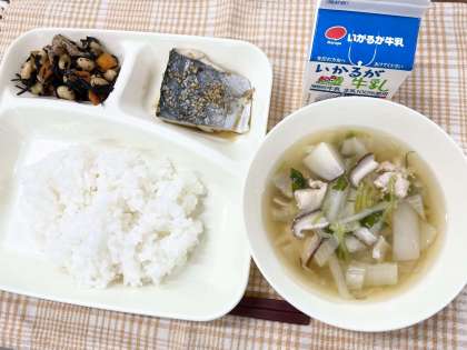 今日の献立は、ごはん・さごしのごまじょうゆかけ・五目汁・大豆の煮もの・牛乳です。