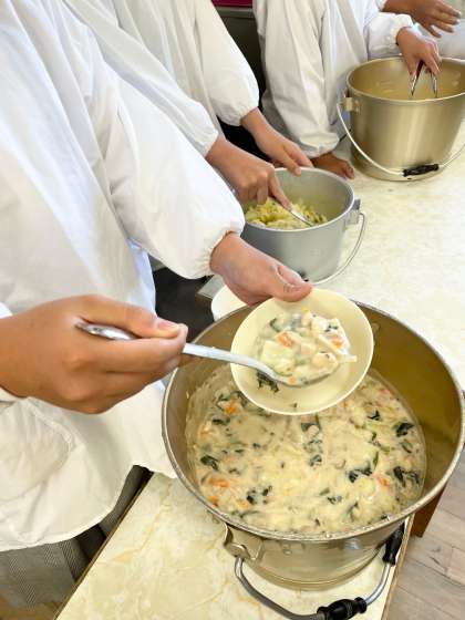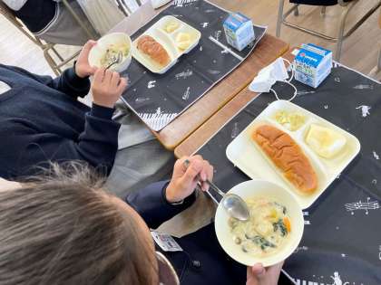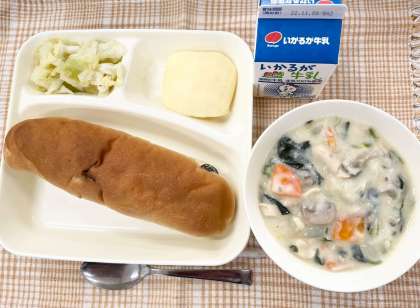 今日の献立は、レーズンパン・きのこのクリームシチュー・キャベツのピクルス・りんご・牛乳です。
