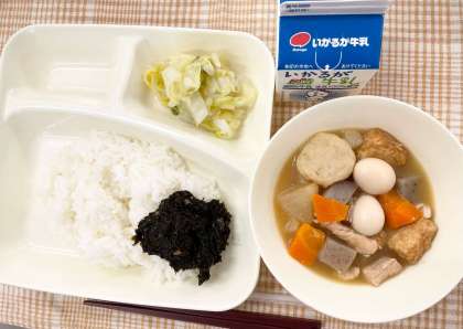 今日の献立は、ごはん・関東煮・はくさいの甘酢あえ・のりのつくだ煮・牛乳です。