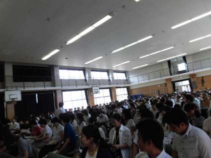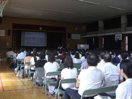 本校教員だけではもったいないと考え、大阪市内の小・中・特別支援学校にも案内したところ、なんと230名もの申し込みがあり、講堂は大阪市の「がんばる先生」たちで大入り満員となりました。