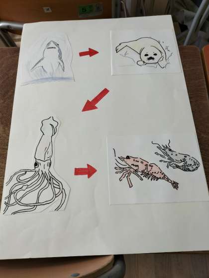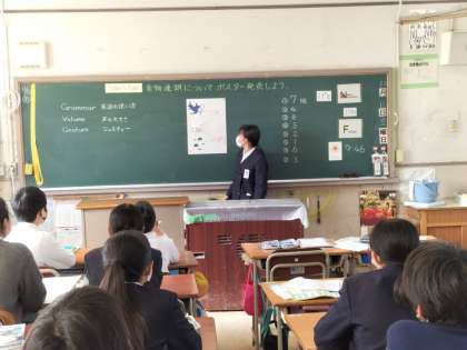 食物連鎖について、英語で発表しました。日本語でも発表するにはなかなか難しい内容ですが、グループで協力して上手に発表していました。