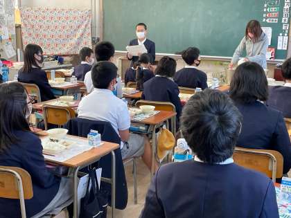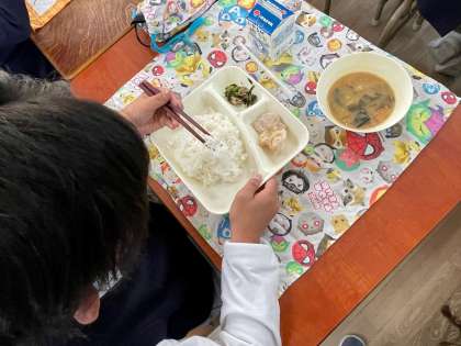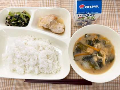 今日の献立は、ごはん・鶏肉のおろしじょうゆかけ・みそ汁・こまつなのいためもの・牛乳です。