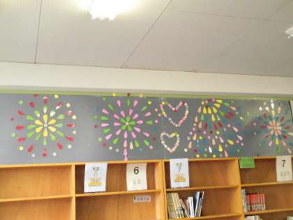 図書館の掲示は夏バージョン、きれいな花火が打ち上げられています。もちろん、図書ボランティア、ハッピー・タイムさんの手作りです。