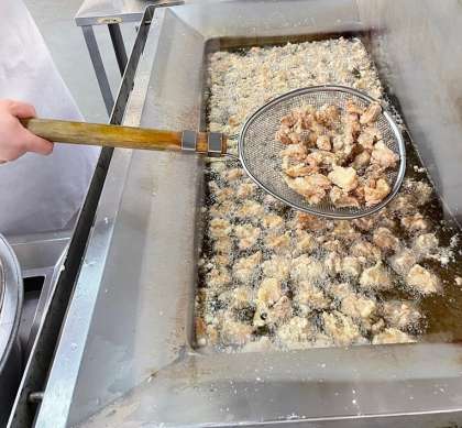今日の献立は、ごはん・あげどりのねぎだれかけ・豚肉とじゃがいもの煮もの・きゅうりの赤じそあえ・牛乳です。
