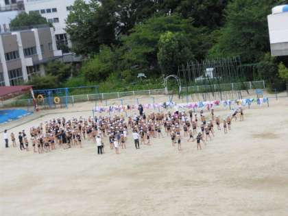 運動場の鉄棒前で、しっかりと準備運動をしてから入ります。(写真は屋上から撮りました。)