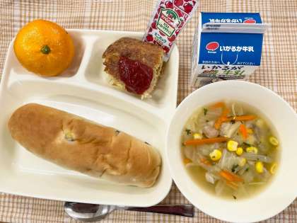 今日の献立は、おさつパン・ツナポテトオムレツ・鶏肉とキャベツのスープ・みかん・牛乳です。