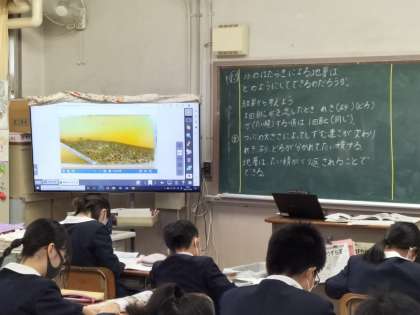地層についての学習です。子どもたちにとって、なかなか身近な話ではないですが、水の働きによって砂や石などが堆積していくことを学習しています。