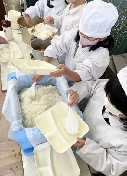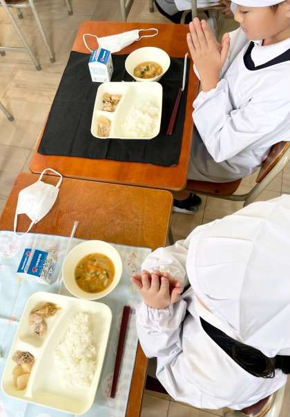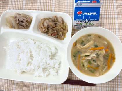 今日の献立は、ごはん・鶏肉の甘辛焼き・みそ汁・だいこんの煮もの・牛乳です。