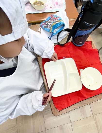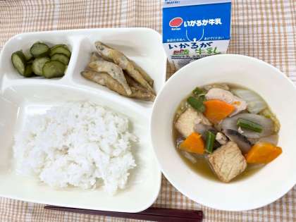 今日の献立は、ごはん・きびなごてんぷら・あつあげと野菜の煮もの・きゅうりの甘酢づけ・牛乳です。