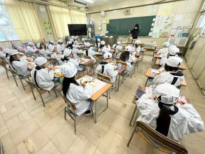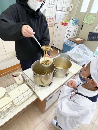今日の献立は、黒糖パン・カレーうどん・はくさいのおひたし・りんご・牛乳です。