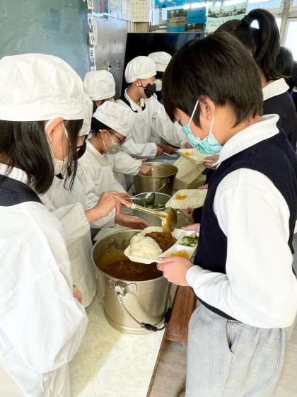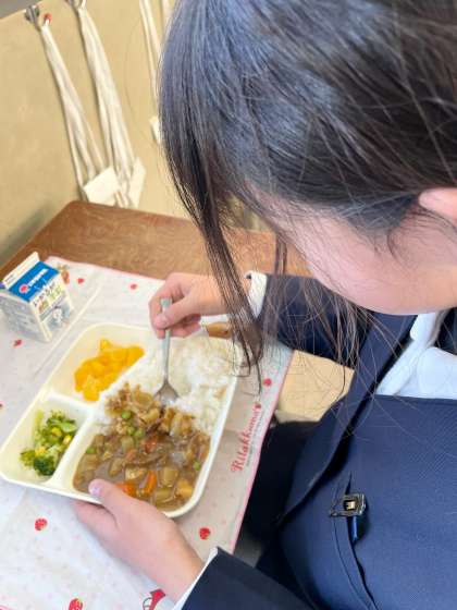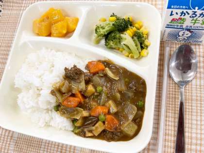 今日の献立は、冬野菜のカレーライス・ブロッコリーとコーンのサラダ・黄桃缶づめ・牛乳です。