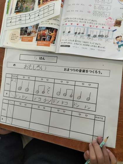 かけ声やリズムをつないで「おまつりの音楽」をつくります。グループで楽しみながら取り組んでいました。