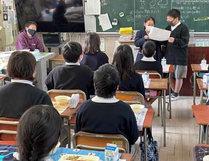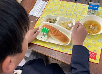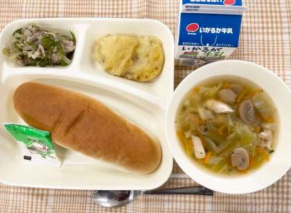 今日の献立は、コッペパン・マーガリン・豚肉と野菜のソテー・スープ・スイートポテト・牛乳です。