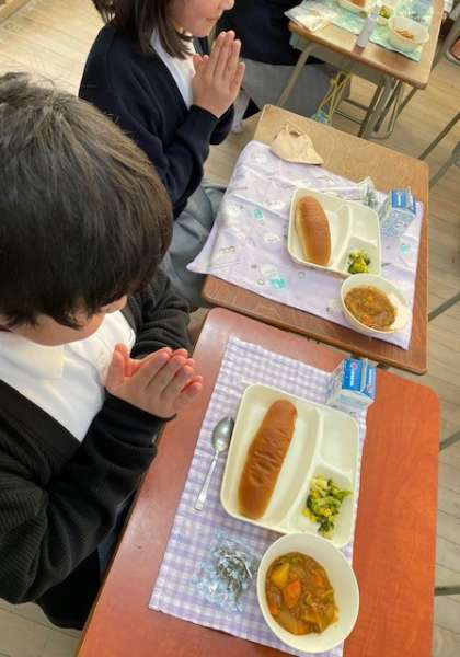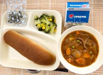 今日の献立は、黒糖パン・ビーフシチュー・ブロッコリーとコーンのサラダ・ミニフィッシュ・牛乳です。