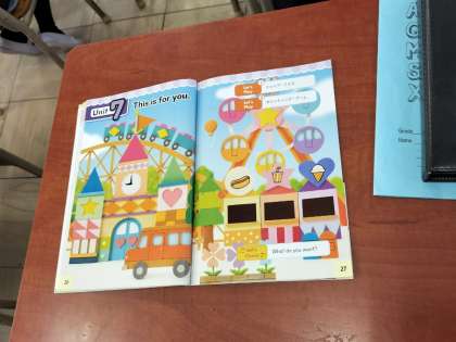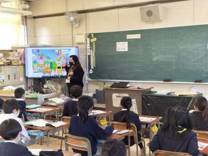 長方形や円などの形を英語で話しました。難しい発音の言葉もありましたが、よく聞いて話していました。