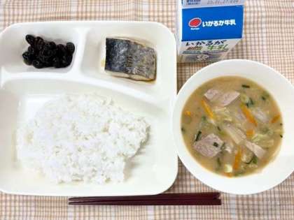 今日の献立は、ごはん・さごしのしょうゆだれかけ・みそ汁・黒豆の煮もの・牛乳です。