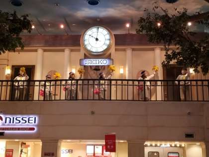 街時計の音楽に合わせてダンスをするパフォーマーや漫才にコント!