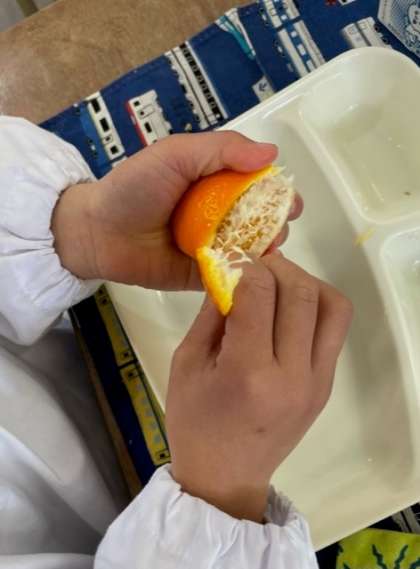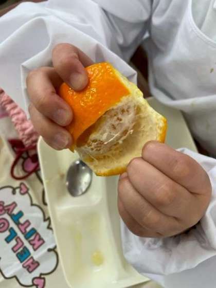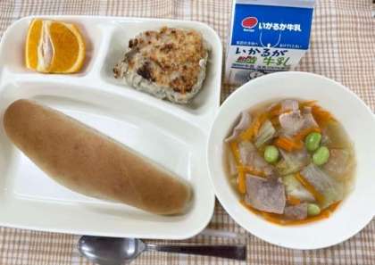 今日の献立は、黒糖パン・押麦のグラタン・豚肉と野菜のスープ・いよかん・牛乳です。