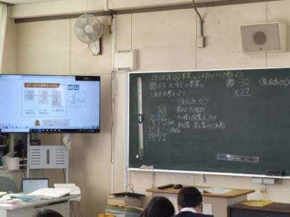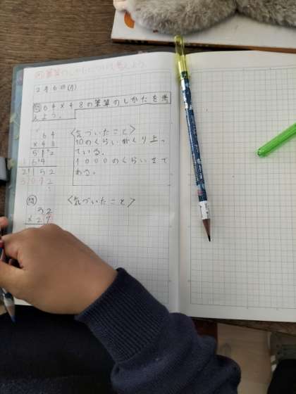 2けた×2けたの筆算の学習です。計算が複雑になってきましたが、くり上がりにも気をつけて計算しています。