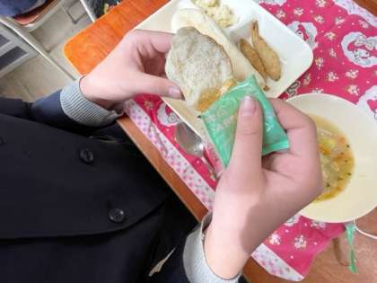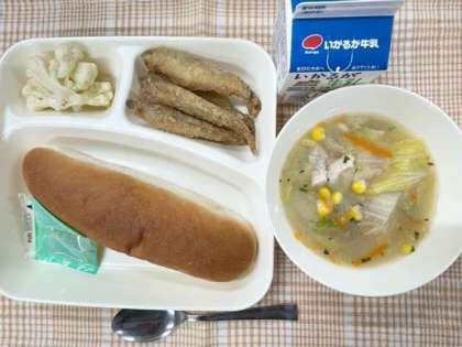 今日の献立は、コッペパン・りんごジャム・わかさぎフライ・コーンとはくさいのスープ・カリフラワーのサラダ・牛乳です。