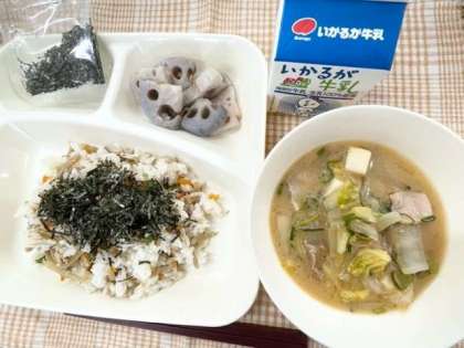 今日の献立は、鶏ごぼうご飯・とうふのみそ汁・焼きれんこん・牛乳です。