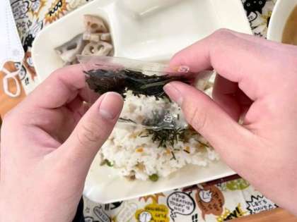 おはしで混ぜたら きざみのりをふりかけます。