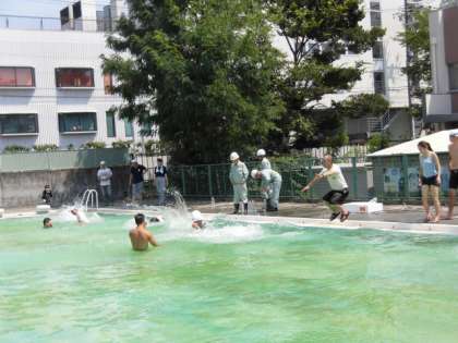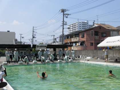 プールサイドは40度近いのではと思うほどの暑さでしたが、みなさん真剣に訓練に取り組んでおられ、本校児童も、見学に来ていました。