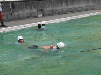 消防署のレスキュー隊により、着衣での浮き方、ペットボトルやロープを使っての救助など、万が一の場合の対処法が指導されていました。