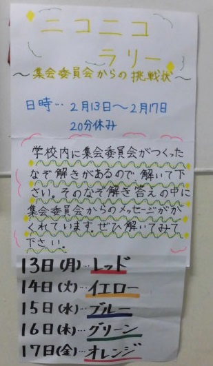 20分休みに、集会委員会が考えたクイズをスマイル隊のメンバーで解いていきます。