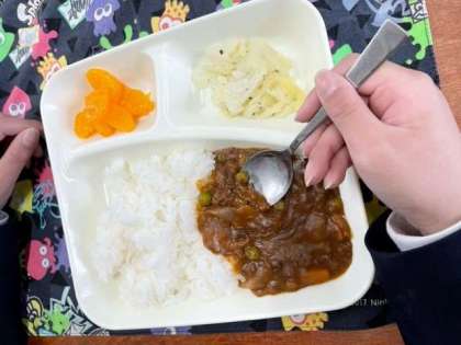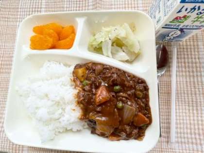 今日の献立は、ハヤシライス・キャベツのバジル風味サラダ・みかんの缶づめ・牛乳です。