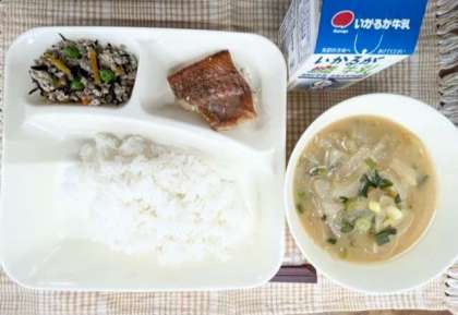 今日の献立は、ごはん・あかうおのレモンじょうゆかけ・みそ汁・高野どうふのいり煮・牛乳です。