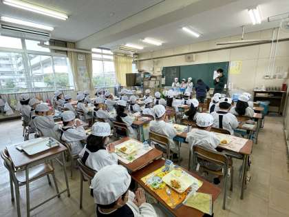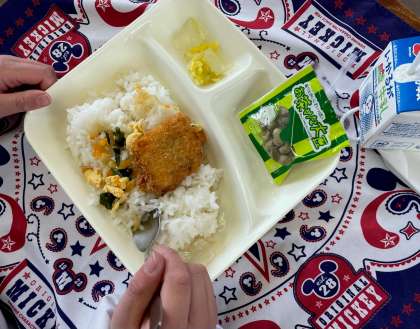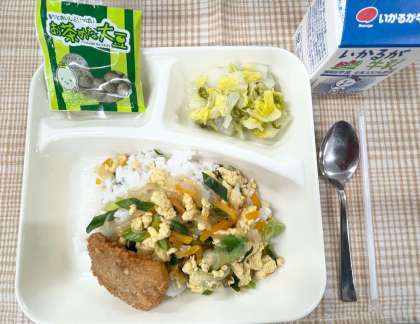 今日の献立は、カツ丼・はくさいの甘酢あえ・まっ茶大豆・牛乳です。