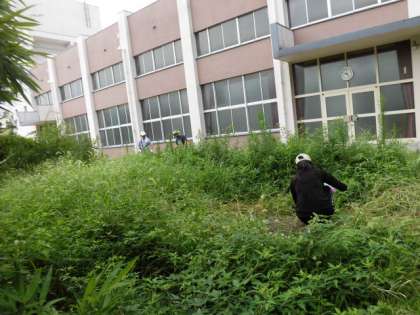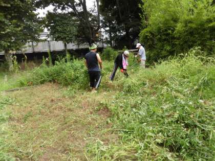 今朝の気温は33度。涼しい!!(?)ということで、地域の方にも手伝っていただき、4名でえの森の草刈り(草抜き)をしました。通路は草刈り機で、学習園や築山の中は手作業です。約2時間格闘して、土が見えました!イモのツルも、何とか元気でした!!