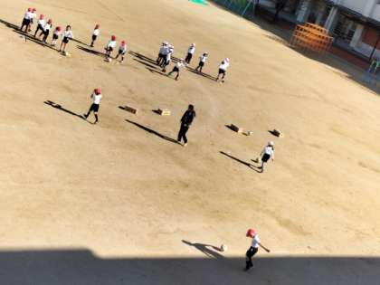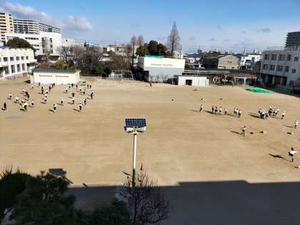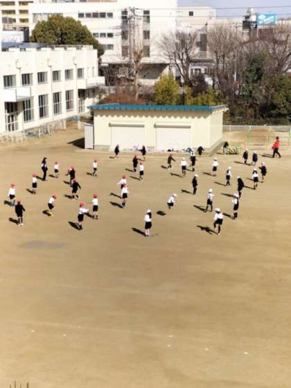 雨上がりの運動場です。冬場は水はけがあまりよくないので水たまりが残っていますが、1年生と2年生が元気に身体を動かしています。